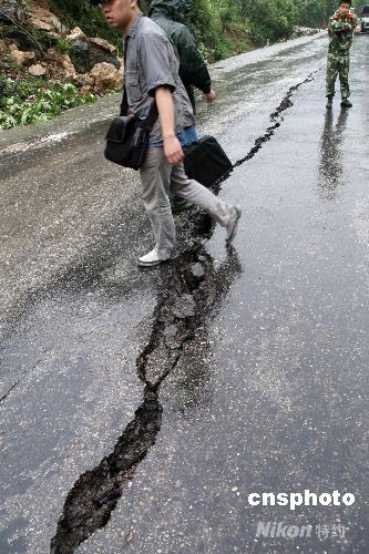 5月13日,通往四川地震重災(zāi)區(qū)綿陽市北川縣的公路上,出現(xiàn)一段段寬窄不等的嚴重裂縫。據(jù)稱,目前通往北川老縣城的唯一道路已被大石阻斷,只能步行攀爬通過。中新社發(fā) 郭晉嘉 攝