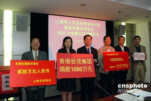 5月14日上午,上海僑商僑界企業(yè)向汶川地震災區(qū)捐款一千萬余元。其中,上海市僑商會會長、世茂集團董事長許榮茂先生以世茂集團名義向災區(qū)抗震救災捐款1000萬元幫助災區(qū)人民度過難關。在上海僑辦舉行的接受僑商僑界企業(yè)向災區(qū)捐贈儀式上,僑辦領導以及機關全體工作人員也向災區(qū)紛紛捐款。中新社發(fā) 王江紅 攝