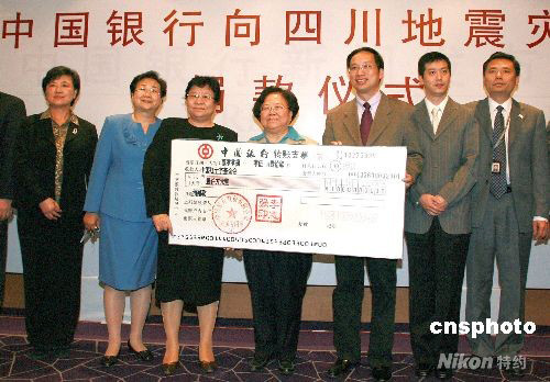 5月14日,中國銀行在北京舉行捐贈(zèng)儀式,向中國紅十字總會(huì)捐款1000萬元人民幣,用于汶川地震災(zāi)區(qū)援救工作。中國紅十字總會(huì)會(huì)長彭佩云代表協(xié)會(huì)接受捐款。至此,中國銀行集團(tuán)已向?yàn)?zāi)區(qū)捐款近2300萬元人民幣,是目前對此次抗震救災(zāi)捐款數(shù)額最大的企業(yè)。中新社發(fā) 廖文靜 攝