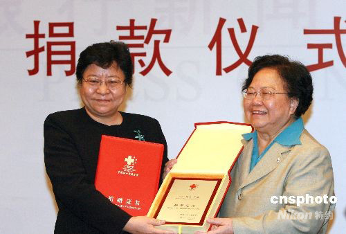 5月14日,中國銀行在北京舉行捐贈(zèng)儀式,向中國紅十字總會(huì)捐款1000萬元人民幣,用于汶川地震災(zāi)區(qū)援救工作。中國銀行副行長張燕玲(左)接受捐款證書并在發(fā)布會(huì)上介紹:中國銀行各一級(jí)分行、直屬分行已為此次抗震救災(zāi)開啟緊急“綠色通道”,免除全部捐款的匯款手續(xù)費(fèi)。中新社發(fā) 廖文靜 攝
