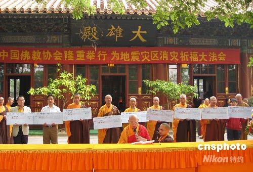 四川省汶川縣發(fā)生七點(diǎn)八級(jí)地震后,中國(guó)佛教協(xié)會(huì)十四日上午在北京廣濟(jì)寺隆重舉行消災(zāi)祈福大法會(huì),F(xiàn)場(chǎng)賑災(zāi)捐款絡(luò)繹不絕,十一世班禪大師捐款十萬(wàn)元人民幣。中新社發(fā) 徐長(zhǎng)安 攝