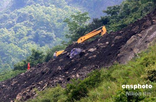 5月14日,四川都江堰紫平鋪水庫附近213國道,搶險隊伍用機器清除塌方山石。由于213國道數(shù)十處嚴(yán)重塌方,從都江堰到映秀、汶川的唯一道路被堵塞難以疏通,對災(zāi)區(qū)的物資救援較為艱難。中新社發(fā) 周青先 攝