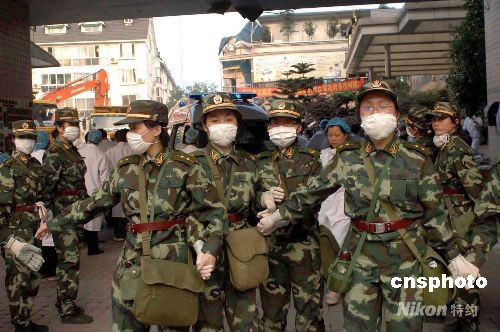 2008年5月15日,四川汶川7.8級地震災(zāi)區(qū)都江堰市危樓排險工作在進(jìn)行中。圖為江堰市一抗震搶險區(qū)大門前,武警女兵對救災(zāi)現(xiàn)場進(jìn)行保衛(wèi)工作。中新社發(fā) 鄒憲 攝