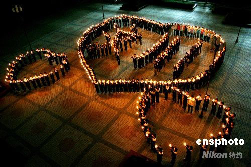 5月15日,在安徽省含山縣第二中學(xué),中學(xué)生手捧蠟燭組成愛心將“汶川”兩字包圍。當(dāng)晚,安徽省含山縣第二中學(xué)開展主題為“燭光祈心愿、愛心獻汶川”的祈福和捐款獻愛心活動,在自發(fā)捐款的同時,近千名中學(xué)生點燃蠟燭,組成“愛心包圍汶川”的圖案,為在四川汶川縣強烈地震中遇難的同胞寄托哀思,同時為幸存者默默祝福,祝愿災(zāi)區(qū)群眾早日度過難關(guān)。中新社發(fā) 程千俊 攝