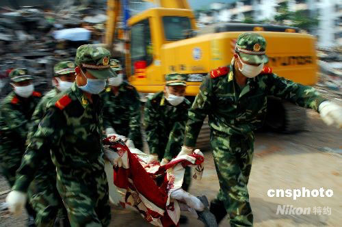 5月15日,在四川省綿竹市漢旺鎮(zhèn)地震重災(zāi)區(qū),數(shù)千名武警、消防官兵與時間賽跑,盡可能地?fù)尵让恳幻焕У臑?zāi)民。中新社發(fā) 李進(jìn) 攝