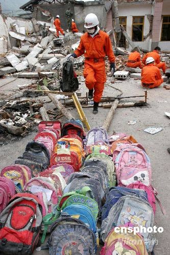 5月15日,在四川省什邡市紅白鎮(zhèn)中心小學(xué)廢墟旁,河南省消防總隊(duì)抗震救災(zāi)突擊隊(duì)的搜救人員將找到的孩子們的書包整齊排放,等待家長認(rèn)領(lǐng),以告慰生者。五顏六色的小書包仿佛一個(gè)個(gè)鮮活的幼小生命立于記者的眼前。 中新社發(fā) 張曉理 攝