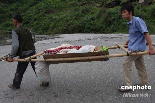 四川大地震,從都江堰到汶川縣映秀鎮(zhèn)沿線民房和交通受損嚴(yán)重,許多受困的居民紛紛離家趕往安全地點,也有許多居民想回家看往地震區(qū)的親人。圖為14日,友誼隧道附近的災(zāi)民把受傷的孩子運往外面進(jìn)行醫(yī)治。中新社發(fā) 黃榮 攝