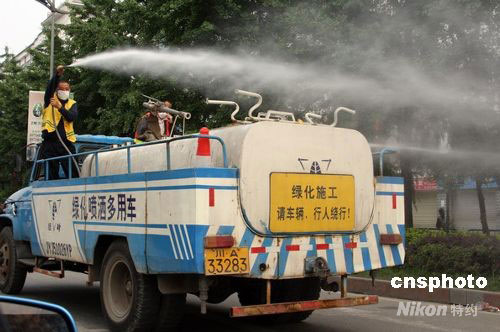 5月16日,四川都江堰市對市區(qū)及災(zāi)民安置點(diǎn)周邊環(huán)境進(jìn)行消毒,加強(qiáng)防疫工作。中新社發(fā) 張雷 攝