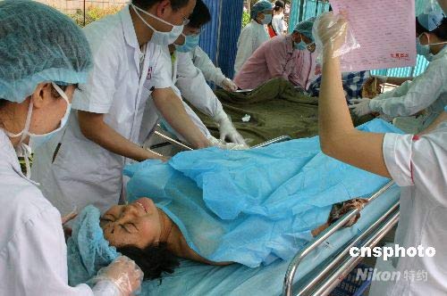 5月16日,成都華西醫(yī)院,來(lái)自汶川映秀鎮(zhèn)、什邡、綿竹等災(zāi)區(qū)的重癥傷員不斷轉(zhuǎn)運(yùn)而至,醫(yī)護(hù)人員和志愿者對(duì)重癥傷員進(jìn)行精心的醫(yī)護(hù)和救治。中新社發(fā) 楊杰 攝