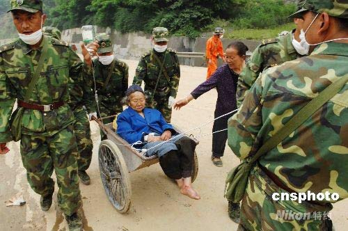 四川“5.12”大地震給北川羌族自治縣、汶川、都江堰等災(zāi)區(qū)帶來特大災(zāi)難,北川縣城遭到毀滅性重創(chuàng)。圖為北川災(zāi)民在救援官兵幫助下撤往安全地帶。中新社發(fā) 陳文 攝