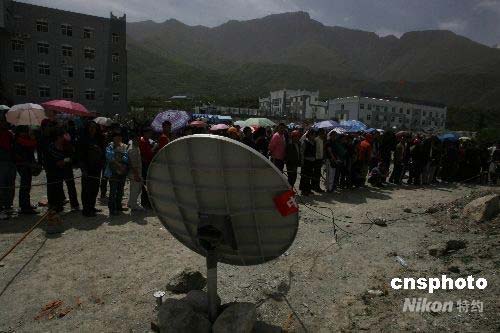 四川省茂縣在大地震后成為通訊和電力完全中斷的“孤島”,5月16日開通第一臺衛(wèi)星電話后,晝夜供百姓向外界報平安,上千人排隊等候一分鐘的寶貴通話。中新社發(fā) 賈國榮 攝