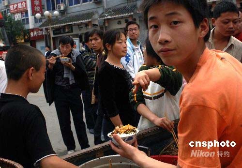四川發(fā)生7.8級地震后,給震區(qū)民眾帶來巨大損失,四川各界民眾紛紛組成志愿者小分隊,以不同形式在地震重災區(qū)為災區(qū)民眾和支援抗震救災的人們提供無私服務。圖為來自農村的青年們,在都江堰市將大桶的米飯、大盆的菜肴與飲用水分發(fā)給都江堰市災民和路人。中新社發(fā) 鄒憲 攝