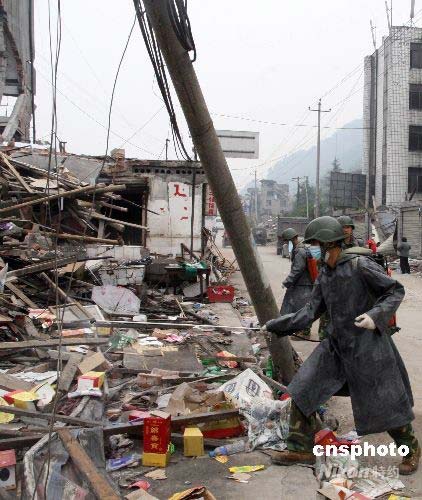 圖:地震重災(zāi)區(qū)什邡紅白鎮(zhèn)開(kāi)始消毒防疫