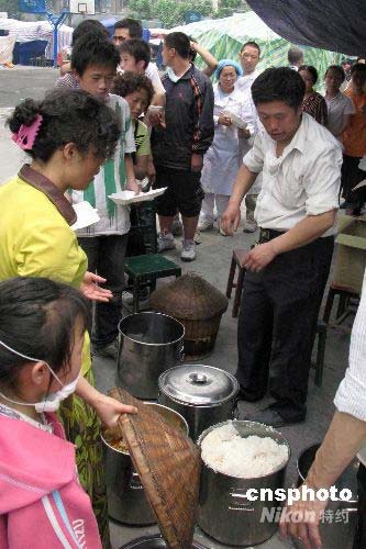 5月16日,四川都江堰一防震棚區(qū)民眾吃午餐時得到80公里外一蔡姓農民全力救助。5月12日中國汶川大地震使四川都江堰市內絕大部分建筑出現(xiàn)致命性破壞,造成許多人員傷亡。居民自建許多防震棚,并在大棚中集體生活就餐。中新社發(fā) 鄒憲 攝