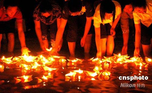 5月16日晚,安徽省蕪湖市辣子村36位四川籍員工將親手折疊的祈福船放入長江漂流,借燭光寄托思念,以漂船渡平安的表達方式,祈求家鄉(xiāng)受災(zāi)的親友戰(zhàn)勝災(zāi)魔。中新社發(fā) 陳立希 攝
