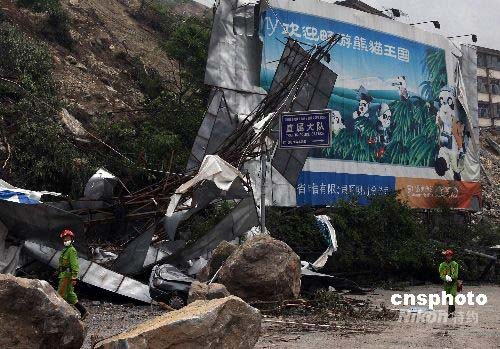 兩名武警搜救隊(duì)員5月17日在映秀鎮(zhèn)通往臥龍的303公路上巡查。5月12日發(fā)生的四川汶川大地震,將映秀鎮(zhèn)通往中國國寶大熊貓最主要保護(hù)區(qū)臥龍的303公路幾乎徹底摧毀。有專家稱,這條公路短期內(nèi)無法修復(fù)。中新社發(fā) 任晨鳴 攝