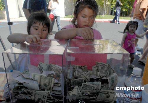 當(dāng)?shù)貢r間五月十七日,四川大地震發(fā)生后的第一個周末,在洛杉磯地區(qū)工作生活的普通華人華僑頂著華氏一百度的高溫走上街頭,為遠(yuǎn)隔萬里的災(zāi)區(qū)同胞默默捐出一張張現(xiàn)金和支票。短短六個小時的街頭募捐活動共籌得四十萬美元。圖為小姐妹將積攢的零花錢全部捐獻(xiàn)給地震災(zāi)區(qū)。中新社發(fā) 張煒 攝