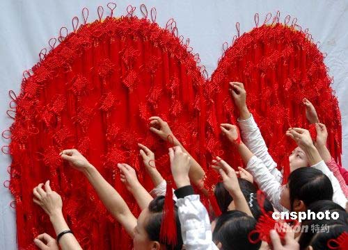 圖:愛(ài)心結(jié)掛上祝福墻祝福汶川