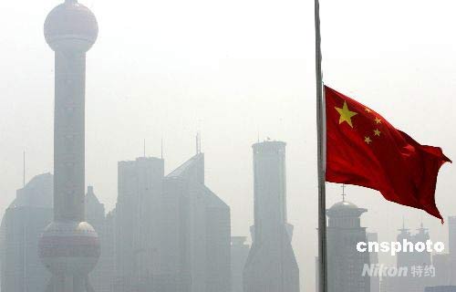 5月19日全國(guó)哀悼日,上海下半旗沉痛哀悼四川地震遇難同胞。為表達(dá)全國(guó)各族人民對(duì)四川汶川大地震遇難同胞的深切哀悼,國(guó)務(wù)院決定,2008年5月19日至21日為全國(guó)哀悼日。在此期間,全國(guó)和各駐外機(jī)構(gòu)下半旗志哀,停止公共娛樂活動(dòng),外交部和中國(guó)駐外使領(lǐng)館設(shè)立吊唁簿。5月19日14時(shí)28分起,全國(guó)人民默哀3分鐘,屆時(shí)汽車、火車、艦船鳴笛,防空警報(bào)鳴響。中新社發(fā) 湯彥俊 攝