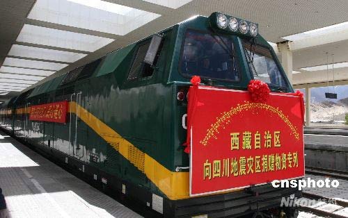 四川汶川大地震發(fā)生后,西藏280萬各族人民情系災區(qū)民族兄弟,掀起西藏歷史上最大規(guī)模的愛心捐助活動。截止5月19日,西藏自治區(qū)民政廳已接收捐贈善款2376萬元人民幣,當日,滿載高原人民深情厚誼的救災物資,搭上西藏史上首列專列駛離拉薩火車站開往四川災區(qū)。中新社發(fā) 柳俊武 攝