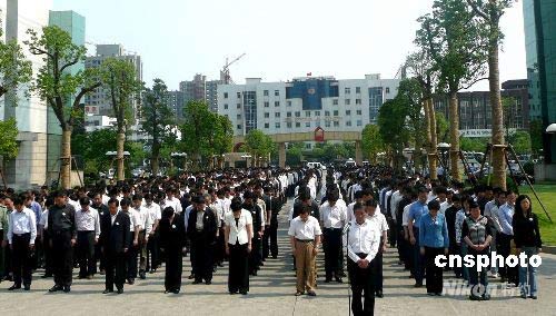 5月19日, 揚(yáng)州市委、市人大、市政府、市政協(xié),各區(qū)委、區(qū)政府及市直有關(guān)部門下半旗,沉痛哀悼四川地震遇難同胞。14時(shí)28分起,全市人民默哀3分鐘,汽車、火車、船舶鳴笛,各防空警報(bào)點(diǎn)防空警報(bào)鳴響。在全國(guó)哀悼日期間,停止公共娛樂(lè)活動(dòng),開(kāi)展一系列的哀悼活動(dòng),以表哀思。截至18日晚,揚(yáng)州市募集賑災(zāi)捐款突破千萬(wàn)元人民幣。圖為揚(yáng)州市政府大院全體工作人員胸佩白花集體列隊(duì)默哀。中新社發(fā) 崔佳明 攝