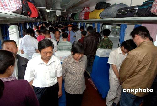 五月十九日十四時(shí)二十八分,福州開往青島四方的K68次列車上,乘客一齊起立為四川汶川大地震遇難同胞默哀。這趟列車按運(yùn)行時(shí)刻表剛好在此時(shí)發(fā)車,由于正值舉國默哀之際,特意推遲三分鐘發(fā)車。中新社發(fā) 王東明 攝