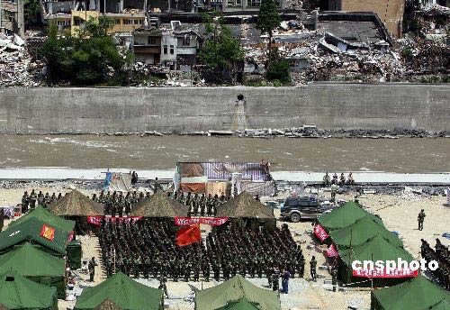 5月19日下午14時(shí)28分,四川省汶川大地震核心重災(zāi)區(qū)映秀鎮(zhèn)一派肅穆,背靠成片的廢墟與湍急的岷江,率先進(jìn)入該鎮(zhèn)救險(xiǎn)的武警四川總隊(duì)官兵面對國旗默哀三分鐘。中新社發(fā) 任晨鳴 攝