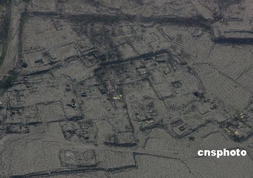 五月十九日,從空中可見汶川大地震造成泥石流掩埋的一個(gè)村莊。中新社發(fā) 賈國(guó)榮 攝