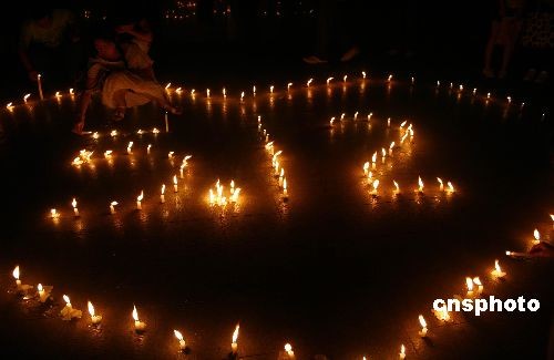 5月19日晚,漢口江灘燭光閃耀,國歌嘹亮,上萬武漢市民自發(fā)來到江灘為在5.12地震中罹難的同胞默哀。