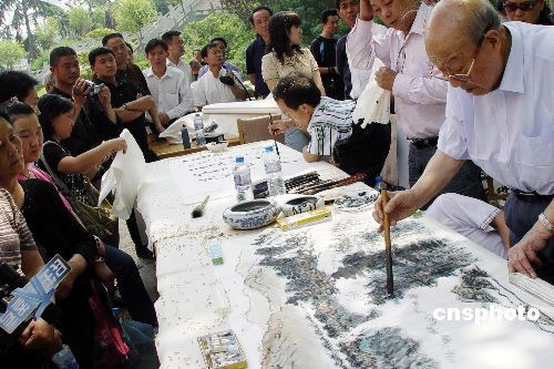 五月二十日,書畫家在鄭州紫荊山公園作畫賑災(zāi)。當(dāng)日,由河南省慈善總會(huì)、省文化廳主辦,河南省嵩陽(yáng)書畫院承辦的“翰墨丹青獻(xiàn)愛(ài)心”大型賑災(zāi)書畫義賣活動(dòng)在此舉行,所得善款將全部轉(zhuǎn)至四川地震災(zāi)區(qū)。 中新社發(fā) 李志全 攝