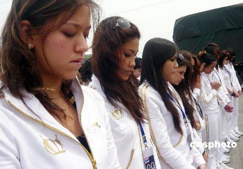 5月19日14時(shí)28分,為表達(dá)中國各族人民對(duì)四川汶川大地震遇難同胞的深切哀悼,中國國務(wù)院決定,2008年5月19日至21日為全國哀悼日。圖為正在中國廣西參加2008亞洲超級(jí)模特大賽的各國選手向四川汶川大地震遇難者默哀。中新社發(fā) 錢興強(qiáng) 攝