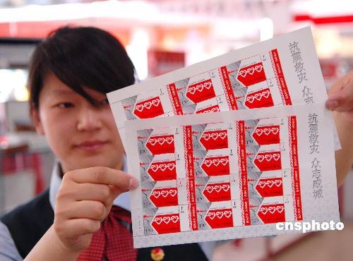 2008年5月20日,濟南市郵政局趵突泉郵電支局員工展示《抗震救災(zāi) 眾志成城》賑災(zāi)郵票。為進一步向地震災(zāi)區(qū)提供社會援助,當(dāng)日,中國郵政特別發(fā)行《抗震救災(zāi) 眾志成城》賑災(zāi)附捐郵票一套一枚,售價2.20元,其中郵票面值1.20元,附捐金額1元。該套郵票采用主、附票形式,畫面表現(xiàn)了全國各族人民在嚴(yán)重的地震災(zāi)害面前手拉手、心連心,眾志成城的堅定意志和無私奉獻精神。據(jù)了解,為了表達全體郵政員工對地震災(zāi)區(qū)人民的情誼,中國郵政集團公司決定將此套郵票的全部郵資收入1560萬元和附捐款1300萬元,共計2860萬元通過民政部門捐贈地震災(zāi)區(qū)。中新社發(fā) 崔鵬森 攝