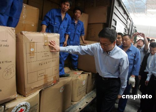 5月20日,上海市市長(zhǎng)韓正親臨火車站指揮調(diào)運(yùn)物資赴川救災(zāi)。截止到19日,上海連續(xù)緊急調(diào)集并運(yùn)往災(zāi)區(qū)抗震救援物資達(dá)1127噸,價(jià)值2954.43萬(wàn)元。中新社發(fā) 湯彥俊 攝