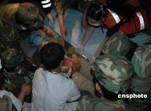 5月20日凌晨4時(shí),在云南駐滇某部劉清泉副師長(zhǎng)等百名戰(zhàn)士護(hù)送下,被埋172小時(shí)的安縣雎水道禧村六組的礦工彭國(guó)華成功獲救,創(chuàng)造了生命的奇跡。中新社發(fā) 王荔 周保全 攝