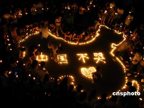 5月20日,全國悼念日第二天,“悼念四川汶川大地震遇難同胞”淮陰師范學(xué)院文通學(xué)院同學(xué)自發(fā)在學(xué)校操場為遇難同胞祈福,“中國不哭”中國加油,成百上千支蠟燭點燃了同學(xué)們的祝福,希望災(zāi)區(qū)人民早日從災(zāi)難中恢復(fù),重建家園。