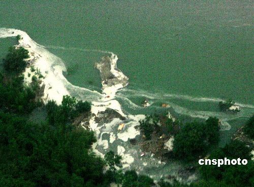 五月二十日,北川重災(zāi)區(qū)的“定時炸彈”--堰塞湖水位上漲危急萬分。一座大山的崩塌堵塞河道形成危險的堰塞湖,如果潰堤將淹沒下游北川全縣和綿陽災(zāi)區(qū)。目前蓄水已經(jīng)淹沒了上游的一些鄉(xiāng)村。中新社發(fā) 賈國榮 攝