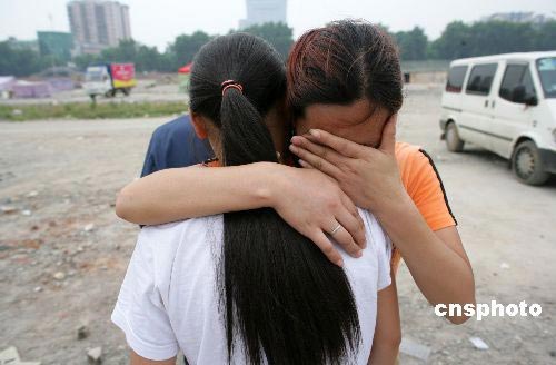 5月20日中午12時20分,在北川中學(xué)學(xué)生臨時安置點(diǎn),李春榕找到了尋找了六天的姐姐的女兒——北川中學(xué)初一六班的楊曉丹,在得知父母已不在人世時,楊曉丹與小姨相擁而泣。中新社發(fā) 劉震 攝