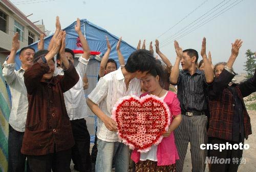5月22日,在汶川大地震重災(zāi)區(qū)——四川安縣黃土鎮(zhèn)馬村境內(nèi)的臨時災(zāi)民救助點里,新郎肖建平與新娘熊招鄰舉行了帳篷婚禮。災(zāi)難會帶給人們創(chuàng)傷,但是無法磨滅人們對美好生活的向往。中新社發(fā) 涂萍 攝