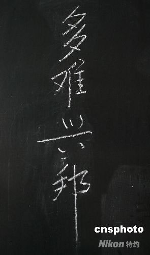 溫家寶總理5月23日在看望臨時(shí)安置在四川綿陽(yáng)長(zhǎng)虹培訓(xùn)中心北川中學(xué)高三同學(xué)時(shí),用粉筆在黑板上寫(xiě)下的“多難興邦”四個(gè)大字。中新社發(fā) 蒲滔 攝