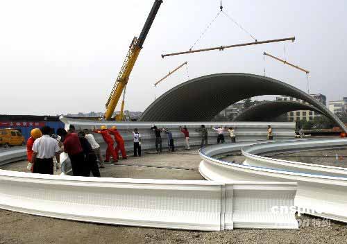 24日,由成都市新都區(qū)組織上千名工人,投資4000萬元,在都江堰市觀鳳小區(qū)為受災群眾援建的安置房落成,2000受災群眾找到了新家。精心的設計,人性化的布置,受到了當地受災群眾的拍手稱贊。圖為工人們正在搭建鋼制拱型餐廳。中新社發(fā) 劉亮 攝