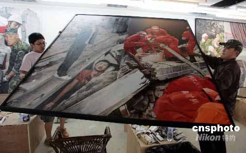 5月25日,參加嘉德義賣的油畫家在北京加緊創(chuàng)作以汶川大地震為主題的巨作。中國嘉德國際拍賣有限公司將于5月27日在北京為四川地震災區(qū)舉行義拍活動。在眾多拍品中,一幅由30位名家集體創(chuàng)作的,2米高、20多米長的抗震救災主題油畫成為最大熱點,該油畫由寫實畫派名家艾軒、楊飛云、王沂東領銜創(chuàng)作,以巨幅作品的形式表現全國人民眾志成城、奮力抗災的感天動地的悲壯情景。中新社發(fā) 楊可佳 攝