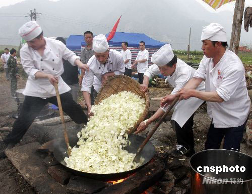 2008年5月25日下午6時(shí),四川彭州市小魚洞鎮(zhèn)大南村田地上,來(lái)自北京的大廚們?cè)跒楫?dāng)?shù)卮迕褡觥百c災(zāi)飯”。24日開(kāi)始,北京美食聯(lián)盟組織北京全聚德、大鴨梨、便宜坊等大飯店的105名廚師,籌集200萬(wàn)元資金在災(zāi)區(qū)分設(shè)3個(gè)賑災(zāi)點(diǎn),免費(fèi)為災(zāi)區(qū)群眾供應(yīng)飯菜。中新社發(fā) 張曉理 攝