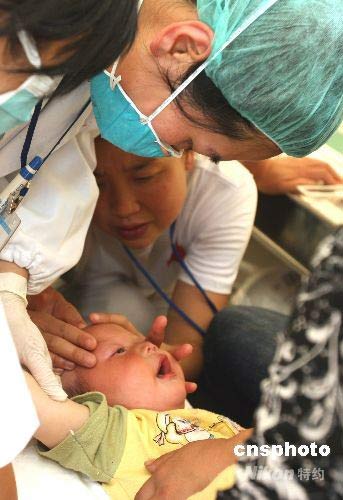 5月26日,由德國援助的“中德紅十字會野戰(zhàn)醫(yī)院”在四川大地震的重災區(qū)都江堰開始接待傷病員。該醫(yī)院由德國紅十字會緊急提供一個全套野戰(zhàn)醫(yī)院設備和11名醫(yī)療技術專家,由中國紅十字會組織上海華山醫(yī)院、四川相關醫(yī)院的醫(yī)務人員接診傷病員,野戰(zhàn)醫(yī)院由手術室、產(chǎn)房、急診室、放射室、實驗室和藥房組成。圖為一名在地震中幸運脫險的半周歲男童,由于多日在防震棚中生活染上不適癥并發(fā)生呼吸緊迫癥后被緊急送到該醫(yī)院搶救。中新社發(fā) 任晨鳴 攝