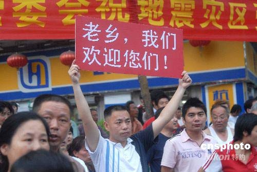 圖為一位市民打出“老鄉(xiāng),我們歡迎您們”的橫幅,歡迎從地震災(zāi)區(qū)來的傷員。