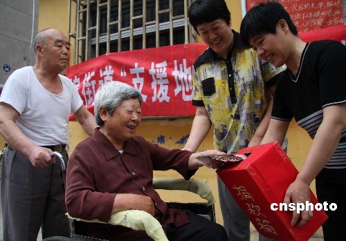 5月27日,退休老人張世俊(左一)推著老伴來(lái)到捐款站,把節(jié)儉下來(lái)的5000元錢(qián)投進(jìn)捐款箱。這是老夫妻倆第三次為地震災(zāi)區(qū)捐款獻(xiàn)愛(ài)心。汶川大地震發(fā)生后,張世俊、李?lèi)?ài)玲夫婦先后三次把省吃儉用的2萬(wàn)元錢(qián)捐給地震災(zāi)區(qū),在當(dāng)?shù)乇粋鳛榧言。中新社發(fā) 吉 喆 攝