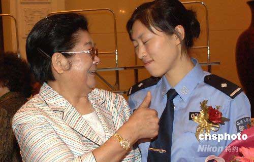 5月29日,全國(guó)婦聯(lián)主席顧秀蓮,在北京人民大會(huì)堂出席“第十四屆宋慶齡樟樹獎(jiǎng)?lì)C獎(jiǎng)典禮”時(shí),與28歲的羌族女民警,第十四屆宋慶齡樟樹獎(jiǎng)特別獎(jiǎng)獲得者--蔣敏交談,并勉力她勇敢地生活下去。在地震中,蔣敏的父母、女兒、奶奶、外婆,全家十口人離開人世。但她毅然放棄回北川尋找親人機(jī)會(huì),連續(xù)工作五晝夜,因勞累過度,多次昏倒在搶險(xiǎn)救援現(xiàn)場(chǎng),被百姓譽(yù)為“最堅(jiān)強(qiáng)的警花”。日前,公安部授予她全國(guó)公安系統(tǒng)一級(jí)英雄模范稱號(hào)。1985年6月,總部在上海的中國(guó)福利會(huì)設(shè)立了宋慶齡樟樹獎(jiǎng),以此表彰為婦女兒童事業(yè)做出卓越貢獻(xiàn)的人士。中新社發(fā) 鄒憲 攝