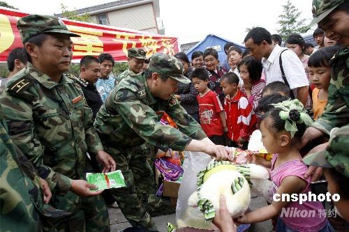 五月三十一日,四川省都江堰市紫坪鋪鎮(zhèn)望江村的孩子們收到了部隊(duì)贈送的兒童節(jié)禮物。四川預(yù)備役高射炮步兵師四團(tuán)負(fù)責(zé)都江堰市望江、黎明、白沙三個行政村的救災(zāi)工作。兒童節(jié)前夕,該團(tuán)為孩子們準(zhǔn)備了書包、玩具,送給當(dāng)?shù)氐暮⒆觽儭V行律绨l(fā) 慎重 攝