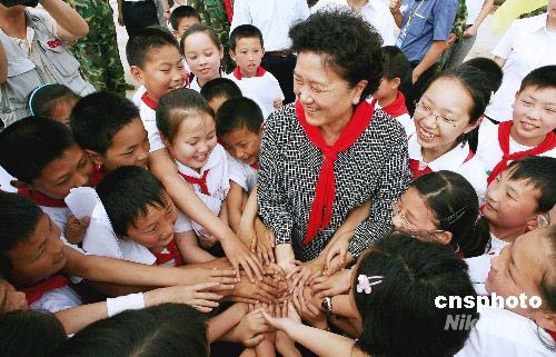 5月30日,中共中央政治局委員、國(guó)務(wù)委員劉延?xùn)|來到四川災(zāi)區(qū),與來自北川的學(xué)生在綿陽(yáng)八一帳篷學(xué)校共慶“六一”兒童節(jié)。中新社發(fā) 蒲滔 攝