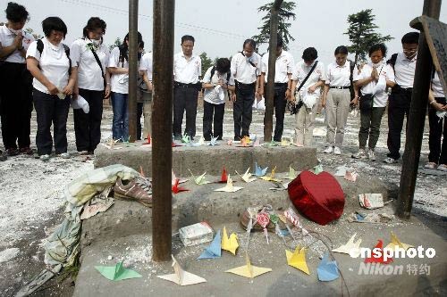六月一日,來自上海的志愿者在四川省都江堰市向地震遇難孩子默哀。當日,國際兒童節(jié),都江堰聚源中學塌樓的廢墟前,許多人沉痛祭奠遇難學生。中新社發(fā) 慎重 攝