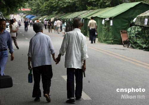 六月一日,唐家山堰塞湖避險(xiǎn)疏散預(yù)案三分之一潰壩方案涉及的下游群眾,已全部撤離到安全地帶。 一對(duì)年過古稀的老人牽手在綿陽市游仙區(qū)綿山路上新建的疏散安置點(diǎn)悠閑散步。中新社發(fā) 王瑤 攝